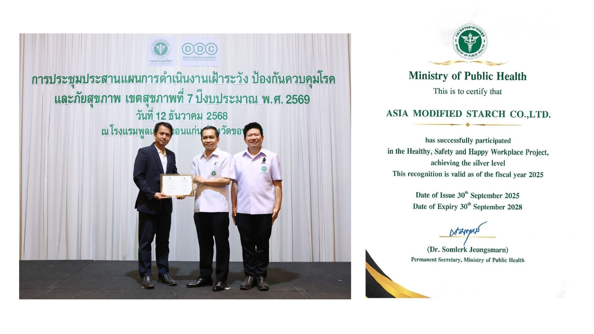 Our company has been officially certified at the Silver Level in the "Healthy, Safety, and Happy Workplace FY2025" project, organized by the Ministry of Public Health.